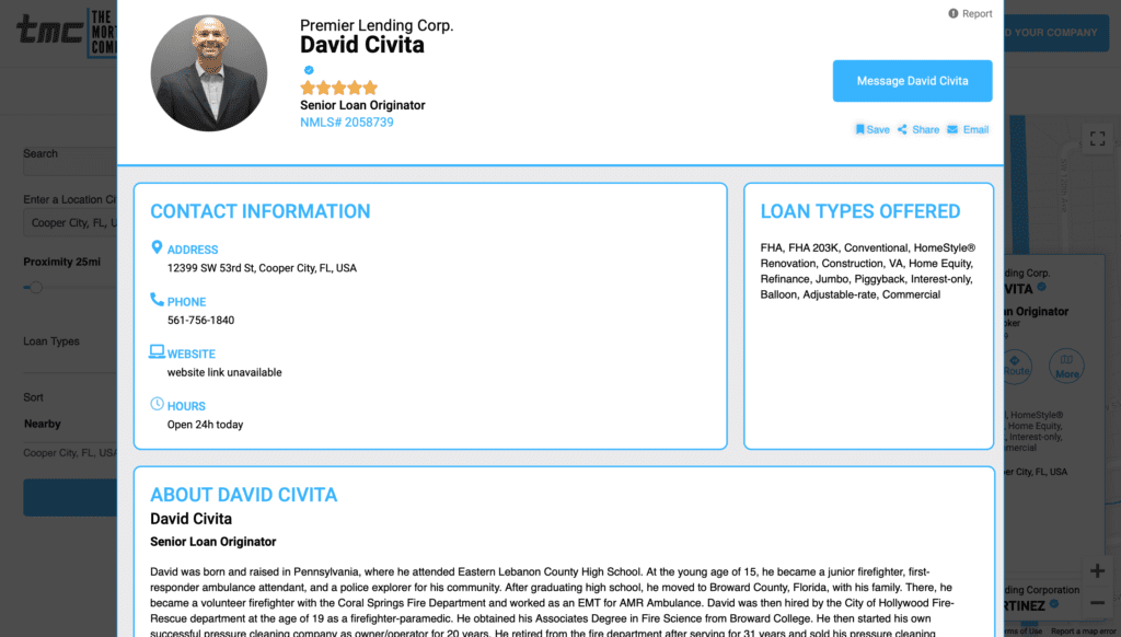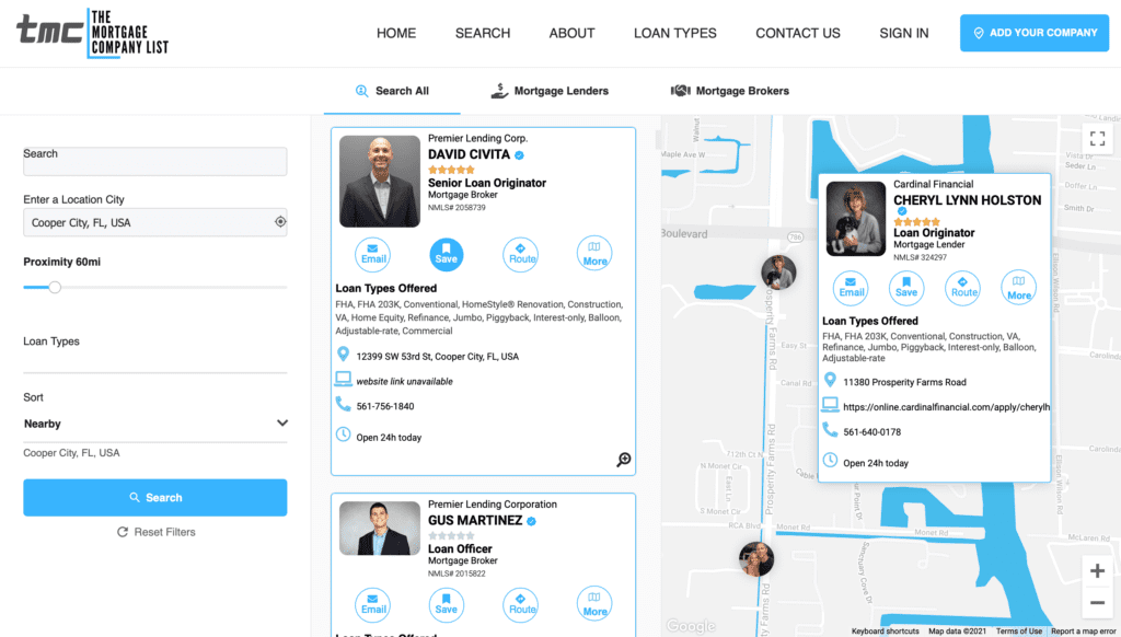 The TMC List uses smart mapping to locate local loan experts based off of your specific area and specific loan types, providing you with the ability to compare and contrast the actual people that initiate the loans.